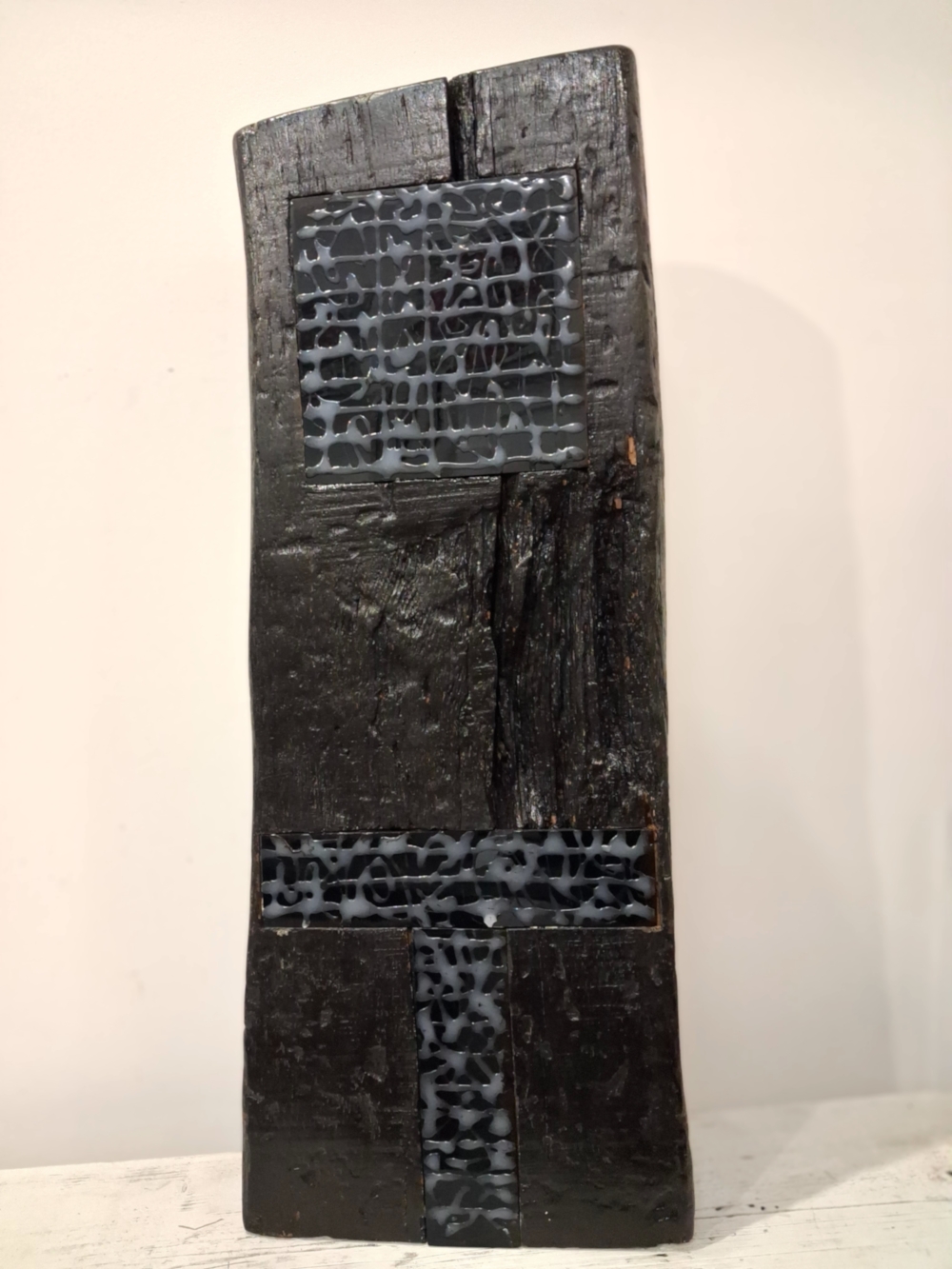 Querstrebe aus Eiche – Mehrfarbig – Leichtmetalllegierung in Luftfahrtqualität – schwarze Altuglas-Platte mit Beschriftung aus weißem Mischharz